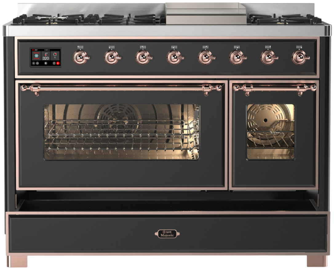 The Majestic 48" dual fuel range combines the classic Italian style and cutting-edge technology. This range features 8 gas burner and griddle, equipped with a total black brass burner with non-stick nanotechnological coating, dual 3.5 + 1.52 cu. ft. total oven capacity, 4.3" full touch oven control display and easy clean enamel oven cavity.Read More