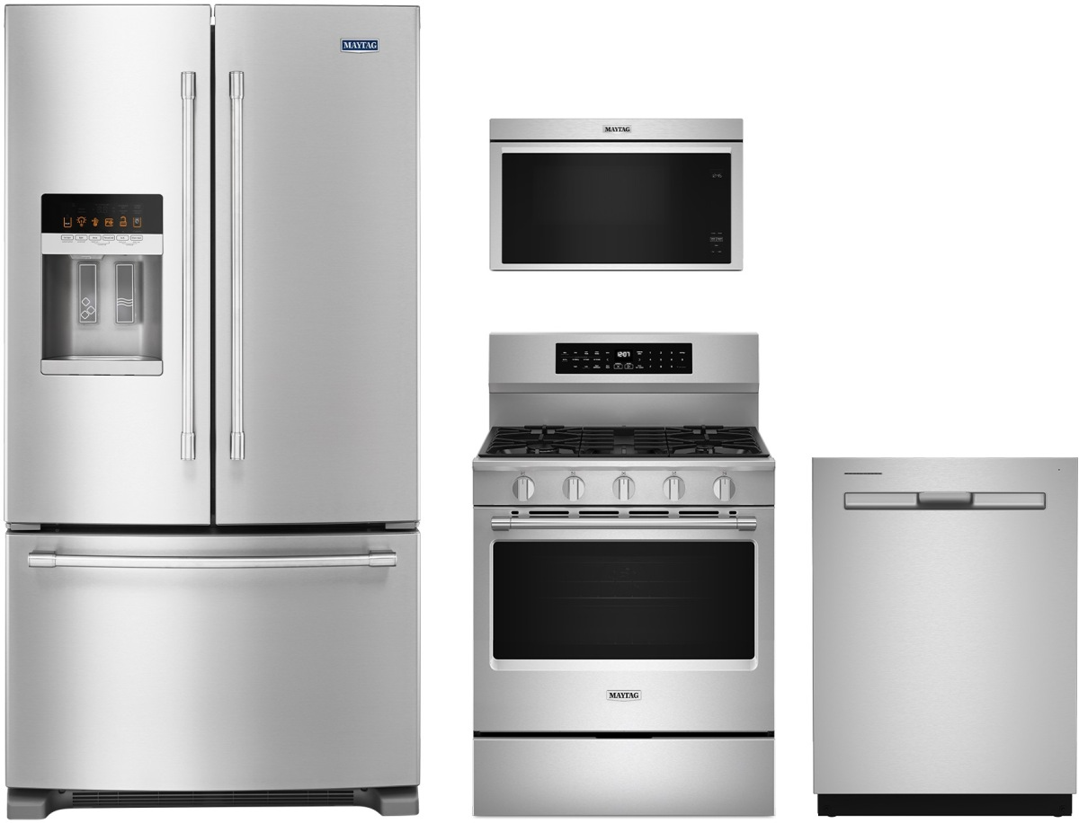 Maytag® 4 Piece Fingerprint Resistant Stainless Steel Kitchen Package with a French door refrigerator, built in dishwasher, freestanding gas range and over the range microwave.Read More